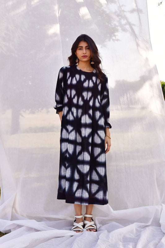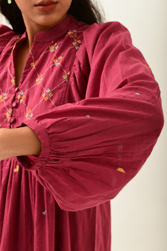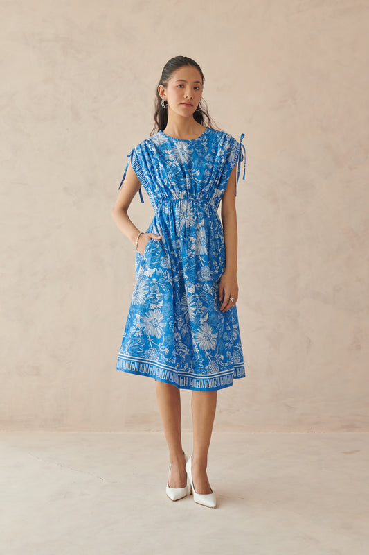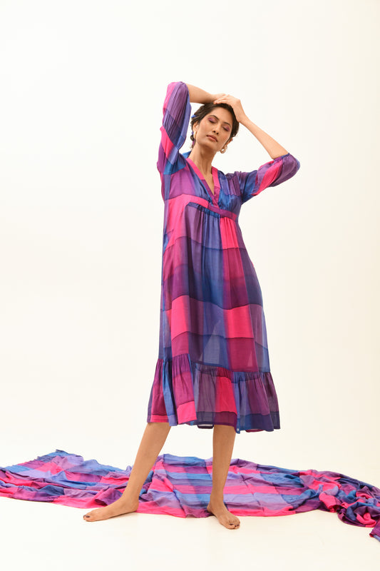 Aura Blue & Fuchsia V-Neck Frilled Dress