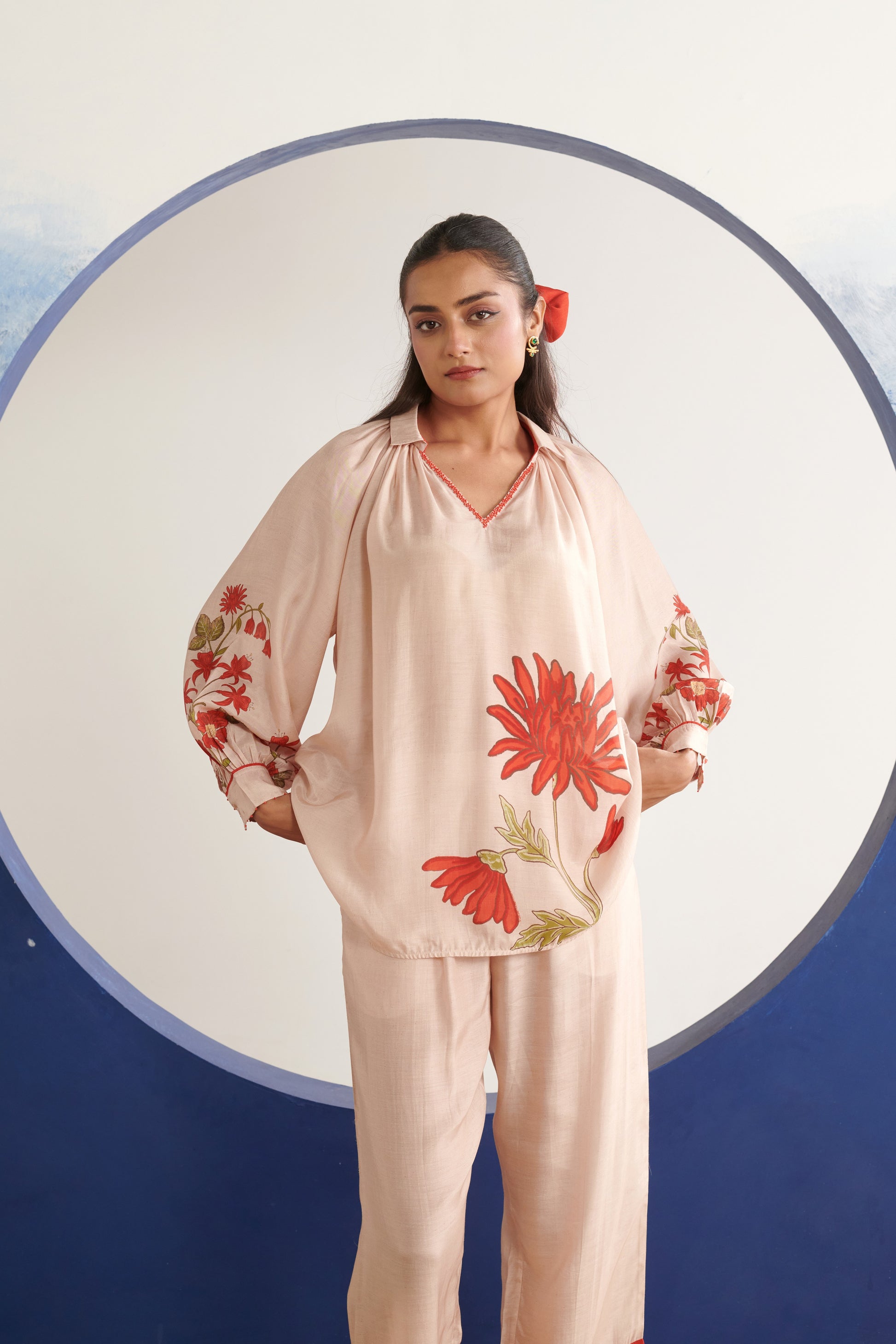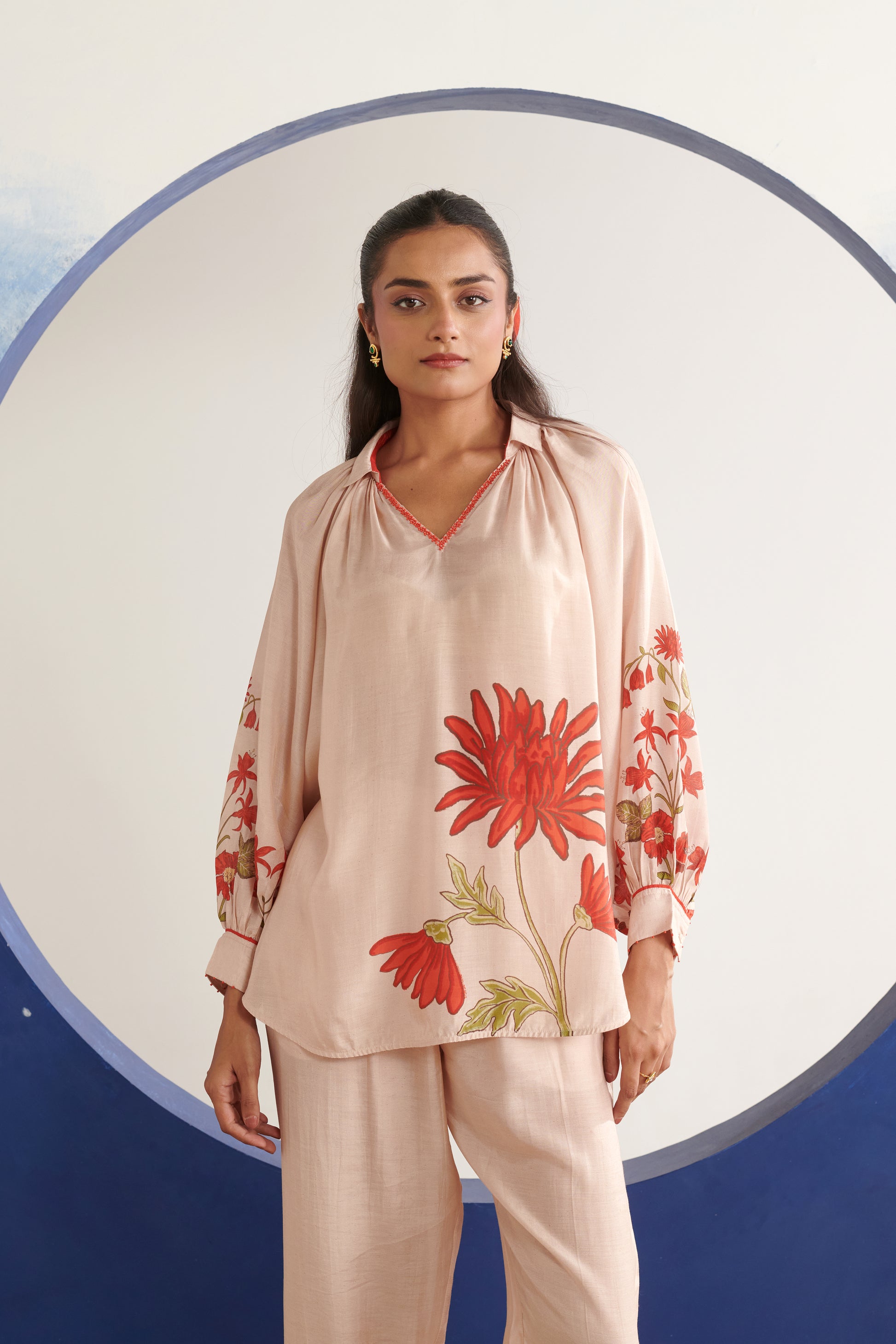 Soft, graceful, and thoughtfully detailed — this relaxed-fit top showcases statement floral placement prints paired with fine hand embroidery. Designed for quiet luxury, it drapes gently on the body while offering elevated comfort.