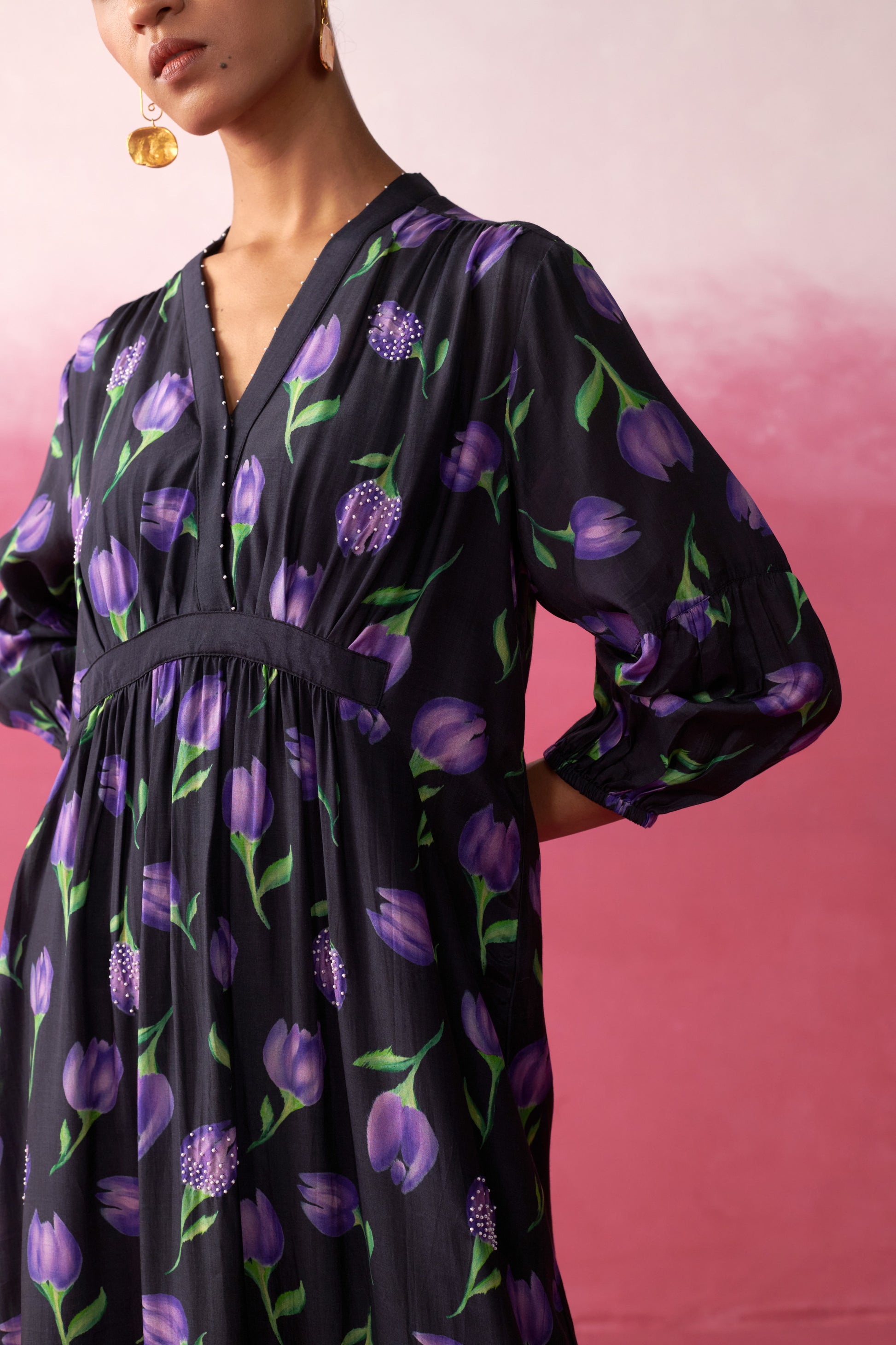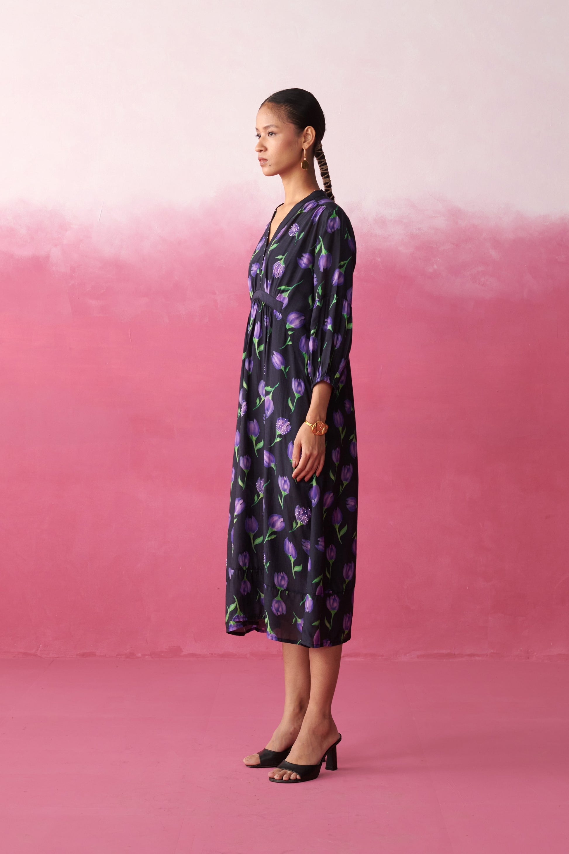 Infused with the quiet elegance of night gardens, this midi dress brings together fluid silhouettes with our signature tulip motifs. The deep base makes the purple blooms pop, creating a striking look that transitions seamlessly from day gatherings to sophisticated soirées.