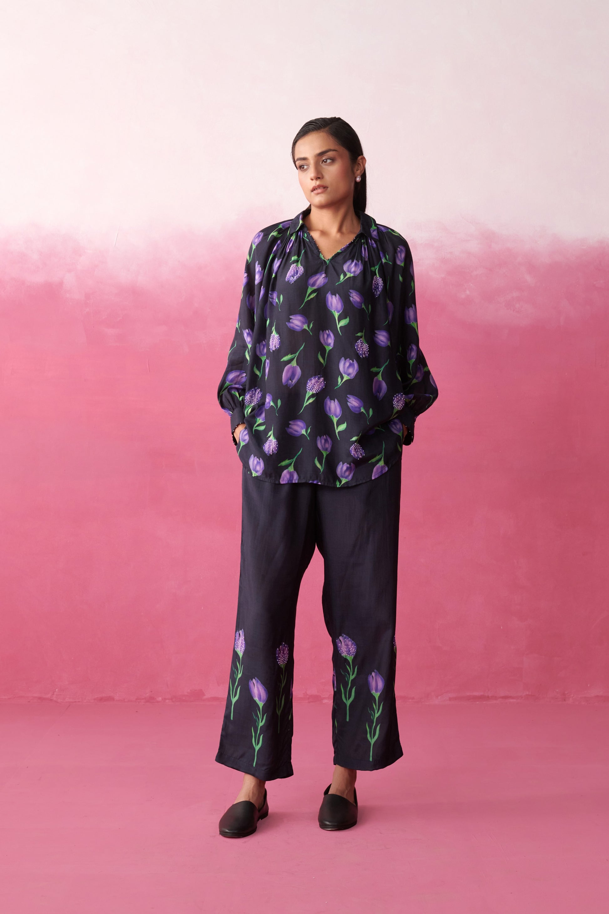 A relaxed silhouette featuring a hand-rendered tulip print in shades of purple against a deep base, The top has a soft, fluid drape that’s both luxurious and breathable and strikes the perfect balance between understated and festive.