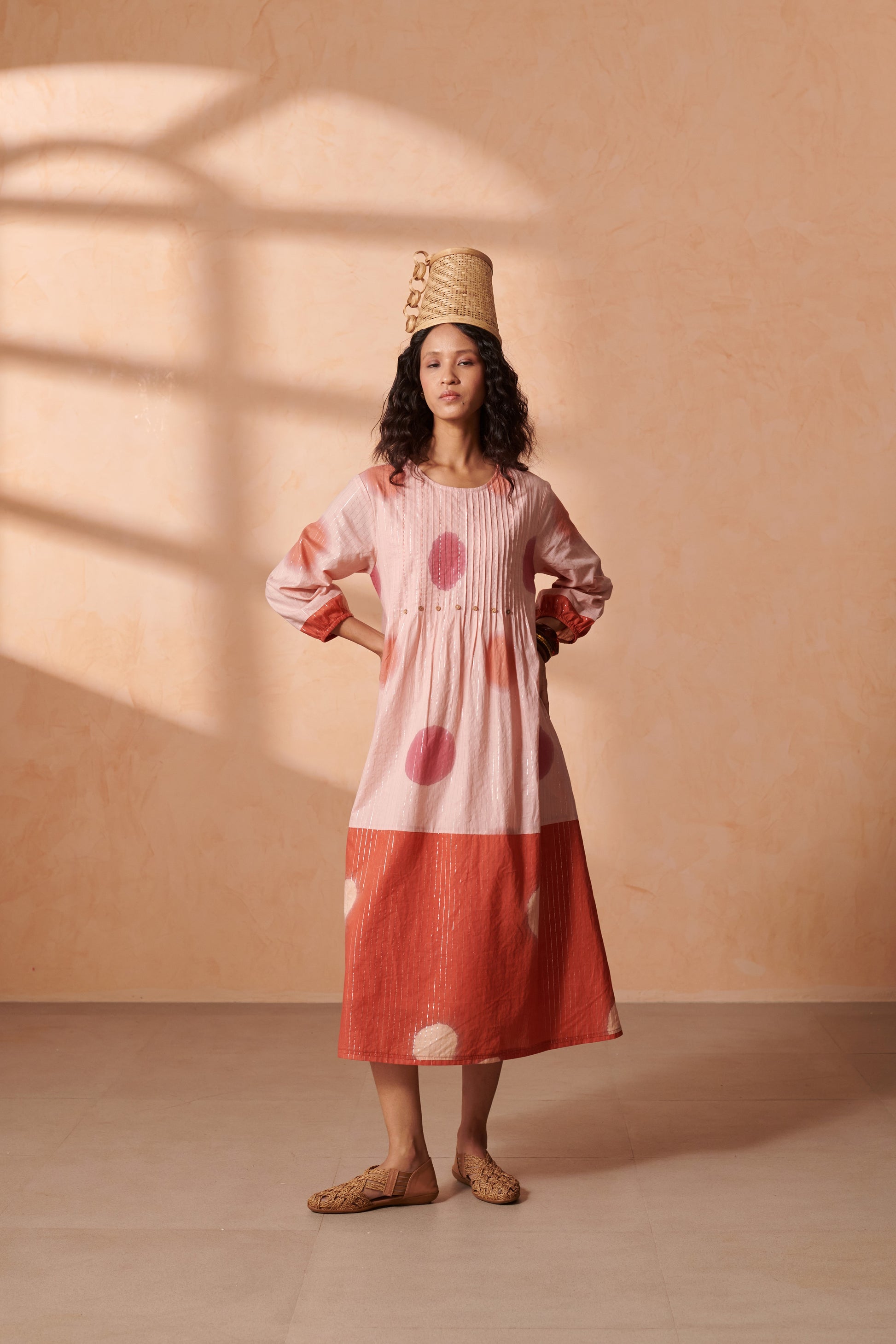 A joyful expression in soft hues β this blush and terracotta dress is hand brush-painted and woven with fine lurex, making it perfect for slow days and sunshine moments alike.