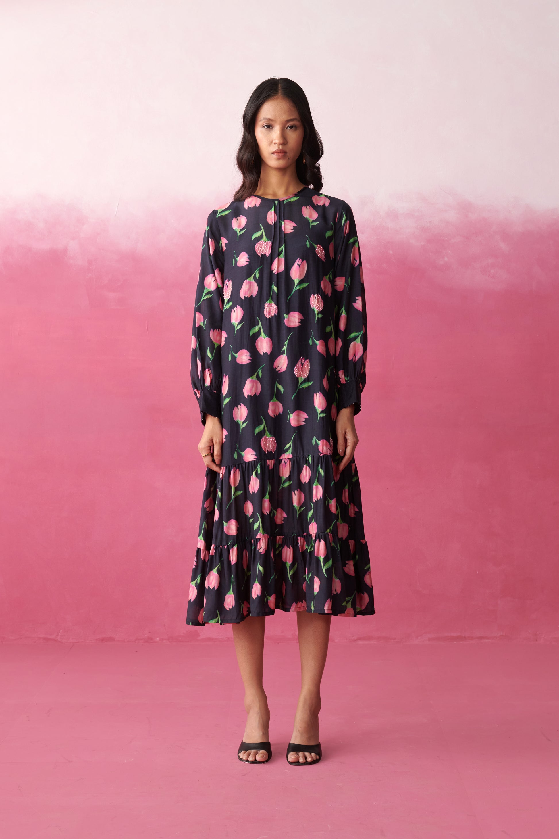 A romantic tiered midi dress in a blush-on-black tulip print that moves beautifully with every step. Designed for women who love fluid movement and an understated glamourous look. Ideal for for festive brunches or intimate evenings.