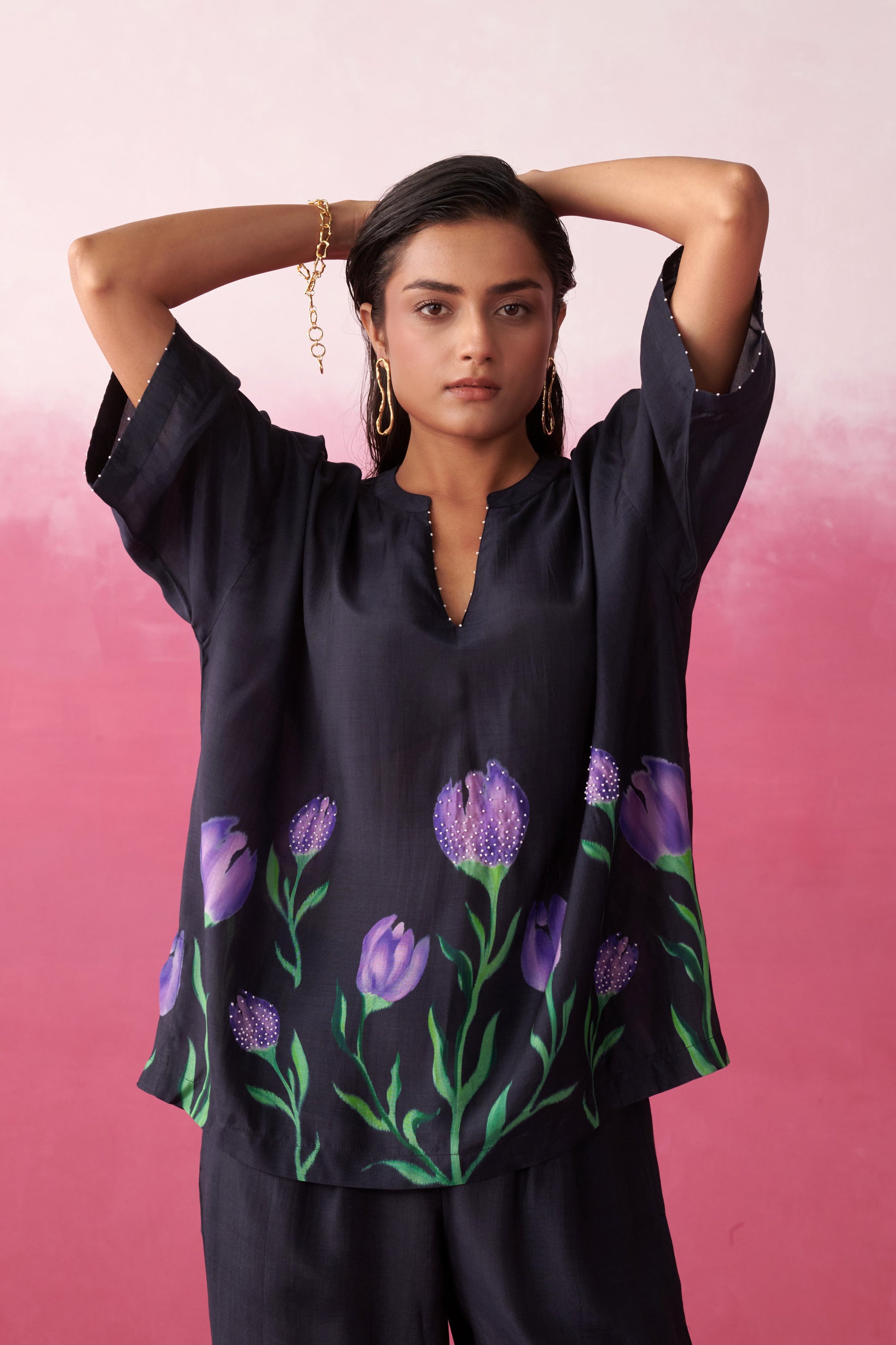 An elegant co-ord set that celebrates artisanal detailing and timeless silhouettes. Designed in cupro,, this set features bold tulip motifs accentuated with intricate hand beadwork — making it perfect for festive soirées and elevated evening gatherings.