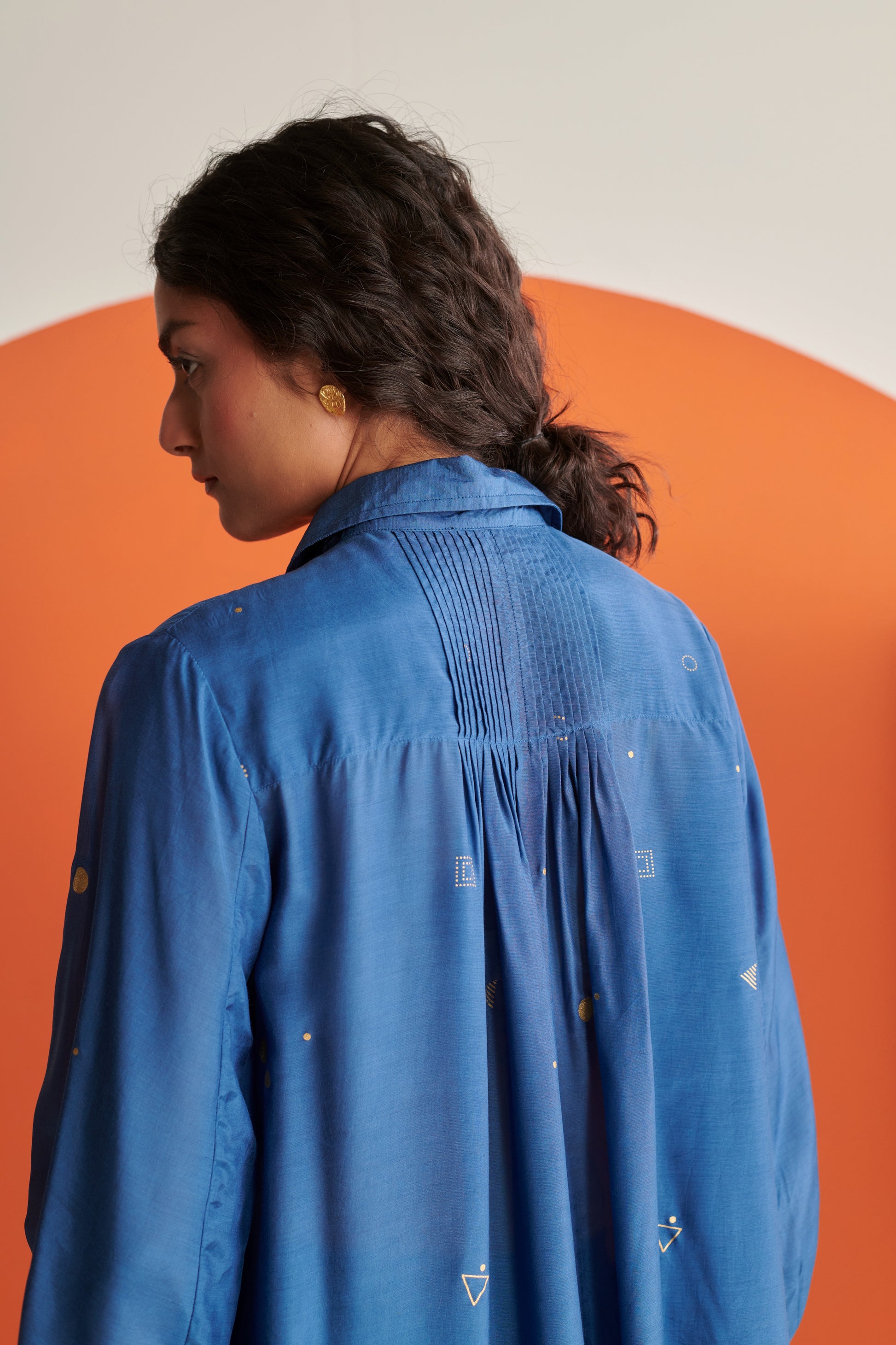*Statement shirt detailed with fine pin-tucks, hand-beaded cuffs, and gold geometric motifs